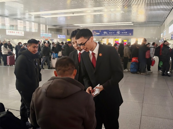 活动当天,干警们在火车站候车厅向过往旅客、车站工作人员及周边商户有序派发宣传单。宣传单一方面聚焦宪法核心条款,用通俗语言解读公民基本权利与义务、司法救济途径等关键内容,让群众快速掌握宪法核心知识,另一方面结合出行场景,梳理了与群众生活密切相关的法律常识,为群众提供实用法律指引。干警们一边派发宣传单,一边主动与旅客沟通,耐心解答大家关于法律条文、维权途径等方面的疑问,用接地气的语言打破法律知识的“专业壁垒”。